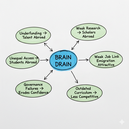 Brain drain, defined as the migration of highly educated and skilled individuals to other countries, has emerged as one of Pakistan’s most pressing socio-economic challenges. Regrettably, each year, thousands of professionals, including doctors, engineers, IT experts, and academics, leave the country in search of better opportunities. This massive outflow reflects structural weaknesses in the higher education system. Some noteworthy issues include underfunding, weak research culture, poor governance, job-market disconnection, and outdated curriculum. These crises in higher education system of Pakistan has encouraged migration and fueled brain drain on a large scale. However, by increasing funding, strengthening governance, and aligning curriculum with job market needs can help mitigate the challenges of higher education and ultimately reduce brain drain.