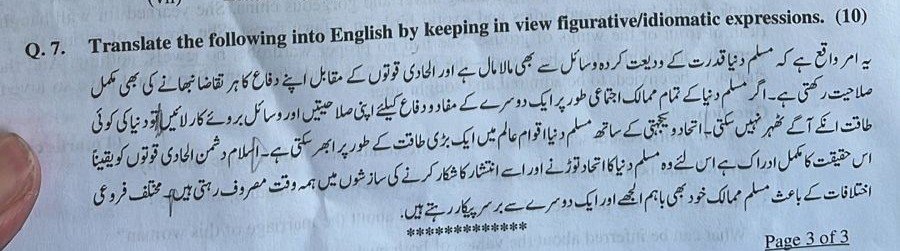 The Urdu-to-English translation challenge evaluates an aspirants’ proficiency in converting ideas from one language to another with precision and fluidity. It not only assesses their vocabulary and understanding of both languages but also measures their ability to uphold correct grammatical rules and coherent sentence structure throughout the translation process. This question requires not just linguistic skills but also a deep appreciation for cultural nuances embedded in the original text.