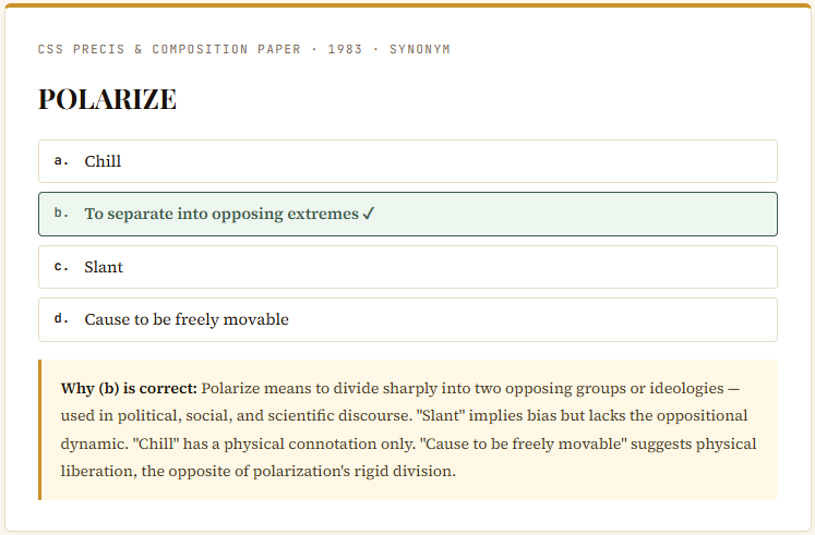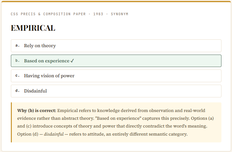 In reality, these questions test your contextual command of academic English. A word like Empirical does not simply mean “based on experience”: it carries with it an entire epistemological weight that distinguishes it from theoreticalspeculative, and hypothetical. The CSS examiner knows this. Your answer sheet must reflect that you know it too.