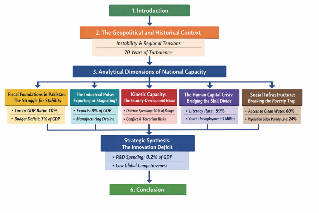 The ultimate measure of national capacity is the integration of all state pillars. The nexus between critically low R&D investment, consistently remaining below 0.3% of GDP, and poor human development suggests an innovation deficit that prevents the country from leveraging its existing industrial base for broader technological advancement. Currently, Pakistan operates in functional silos where security and civilian development rarely intersect for mutual gain. Bridging this gap through shared R&D, institutional reform, and public-private partnerships is necessary to transform isolated sectors of strength into a unified, resilient, and competitive national capacity.
